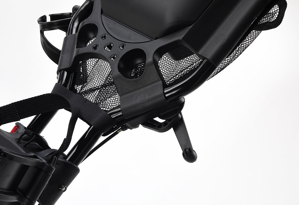 The Compact Golf Cart holds any size golf bag, yet folds up for easy transport and storage. Just press the EZ fold button to collapse and stow in a car trunk, shed or basement. Features a 360-degree front wheel, scorecard holder with storage compartment, beverage caddy, umbrella holder and mesh accessory pouch. The one-touch foot brake locks and unlocks the wheel without bending over. Some assembly required.