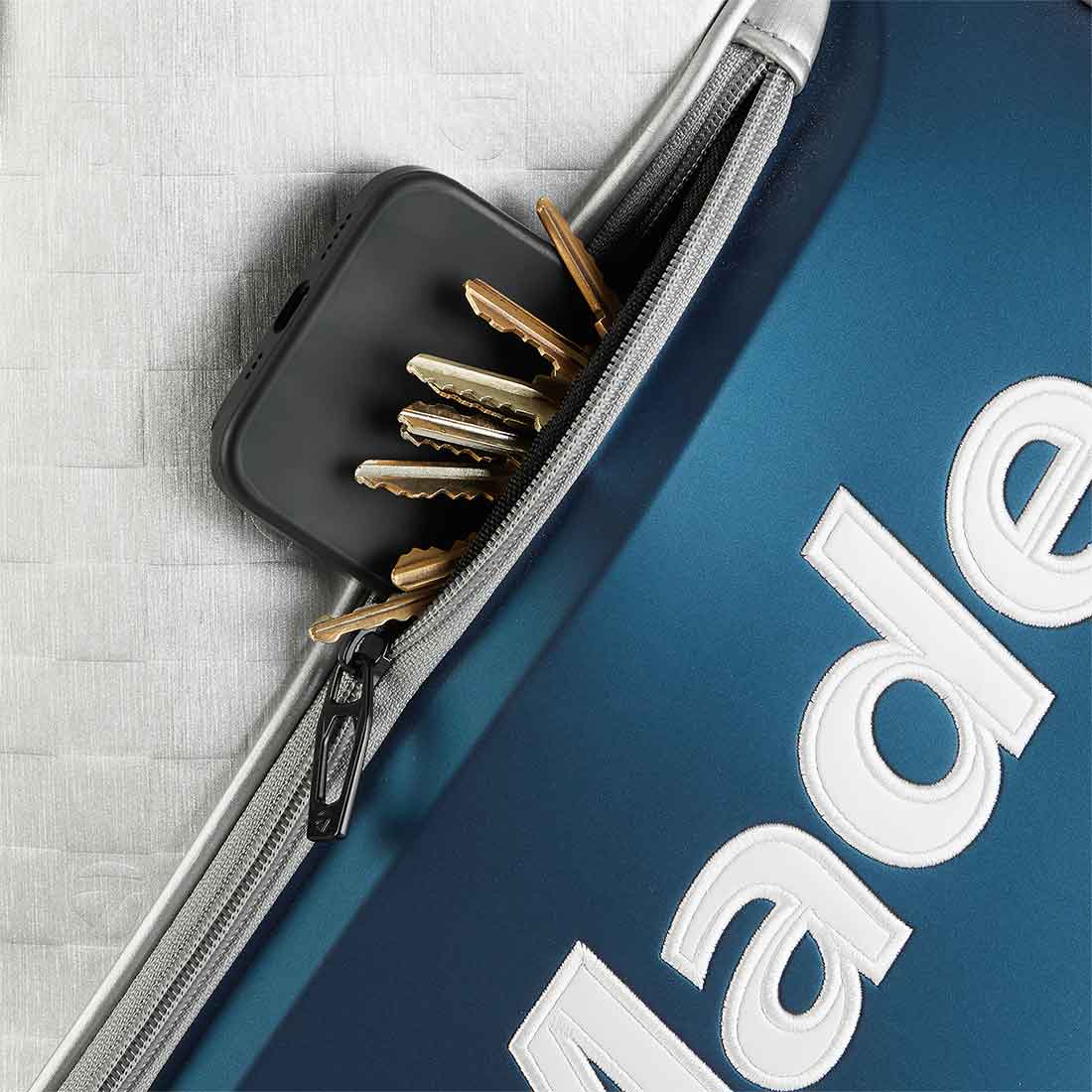 - 2 hard shell stash pockets
