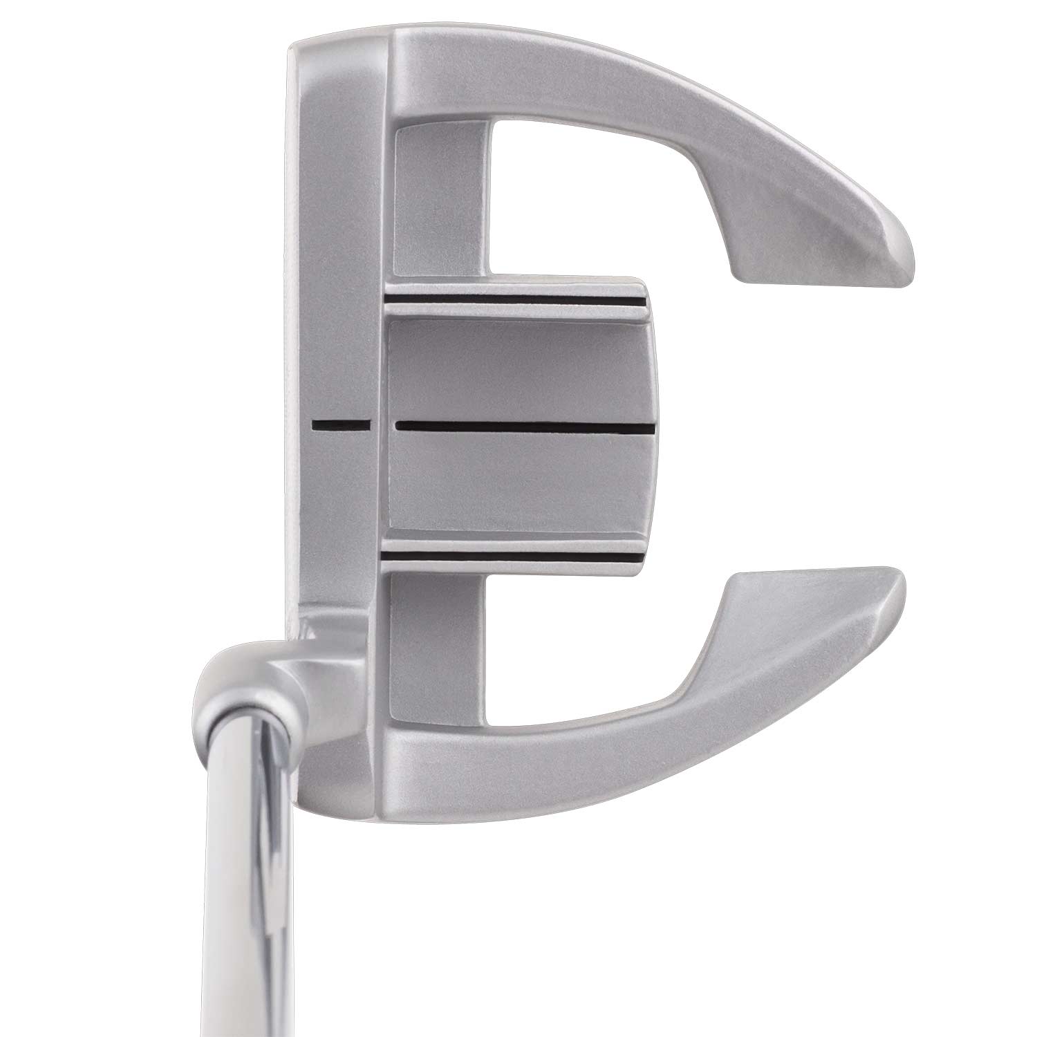 Mallet style putter featuring a plumber neck hosel suited for a slight arc or straight-through stroke.