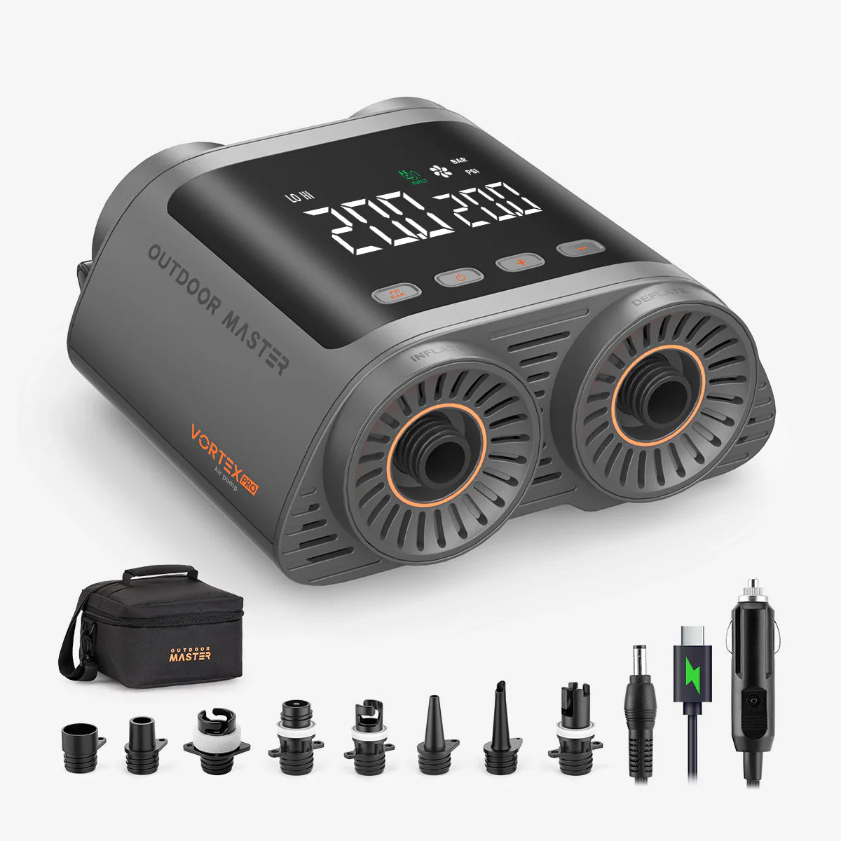 Many rechargeable pumps run out of power too quickly, especially when inflating multiple items or during extended use, forcing frequent recharges and even delaying your trip. The Vortex Pro eliminates battery anxiety with fast, flexible power options. Recharge fully in just 2 hours if you use a 45W fast charger, or stay powered on the go with a 12V car connector or portable power station with rather slow charging. Even if the battery runs out, simply switch to car power and keep inflating. Plus, the built-in USB port doubles as a power bank for your devices. Wherever your adventures take you, the Vortex Pro ensures you’re always ready.